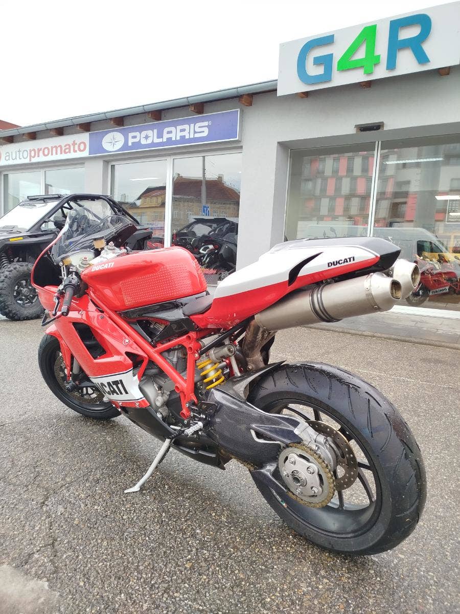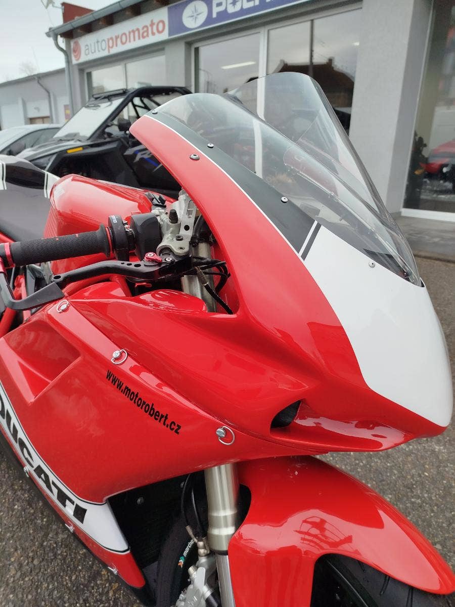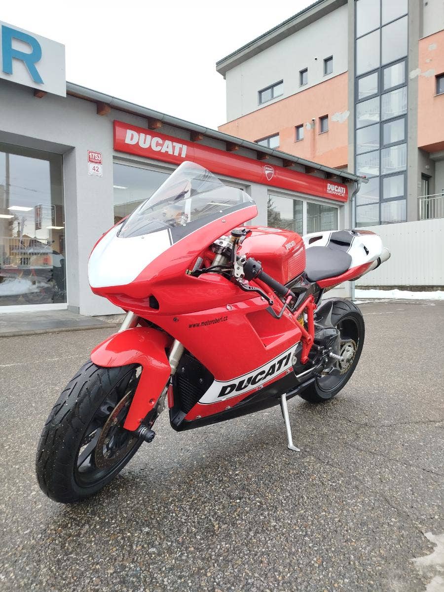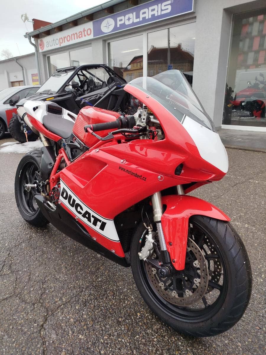 Nabízíme k prodeji krásnou Ducati 848 z roku 2008 a nájezdem 11 353 km převlečenou do kapot. Motorka zakoupená jako nová v ČR v autorizovaném dealerství Ducati. Nyní druhý majitel, 2x klíče, kodovací karta, uživatelský manuál, servisní kniha, elektronický záznam. Pravidelný garanční servis pouze v autorizovaním prostředí, rádi doložíme. Nyní čerstvě po garanční prohlídce u nás. Výměna oleje, olejového filtru, diagnostika, nová baterie. Od desmo servisu najeto cca 500 km. Motorka poskládaná na krásných neporušených kapotách. K dispozici samozřejmě původní kapotáž včetně světel blinkrů v neporušeném stavu dobře zabalené. Bohatá nadstandardní výbava čítající: tlumič řízení, quikshifter, stavitelné páčky, rychlopal Domino, kryty páček, stavitelné přepákování, otevřená spojka. K motorce 3x krabice dílů. Vše je v moc hezkém stavu a lze snadno přeskládat do původního stavu.