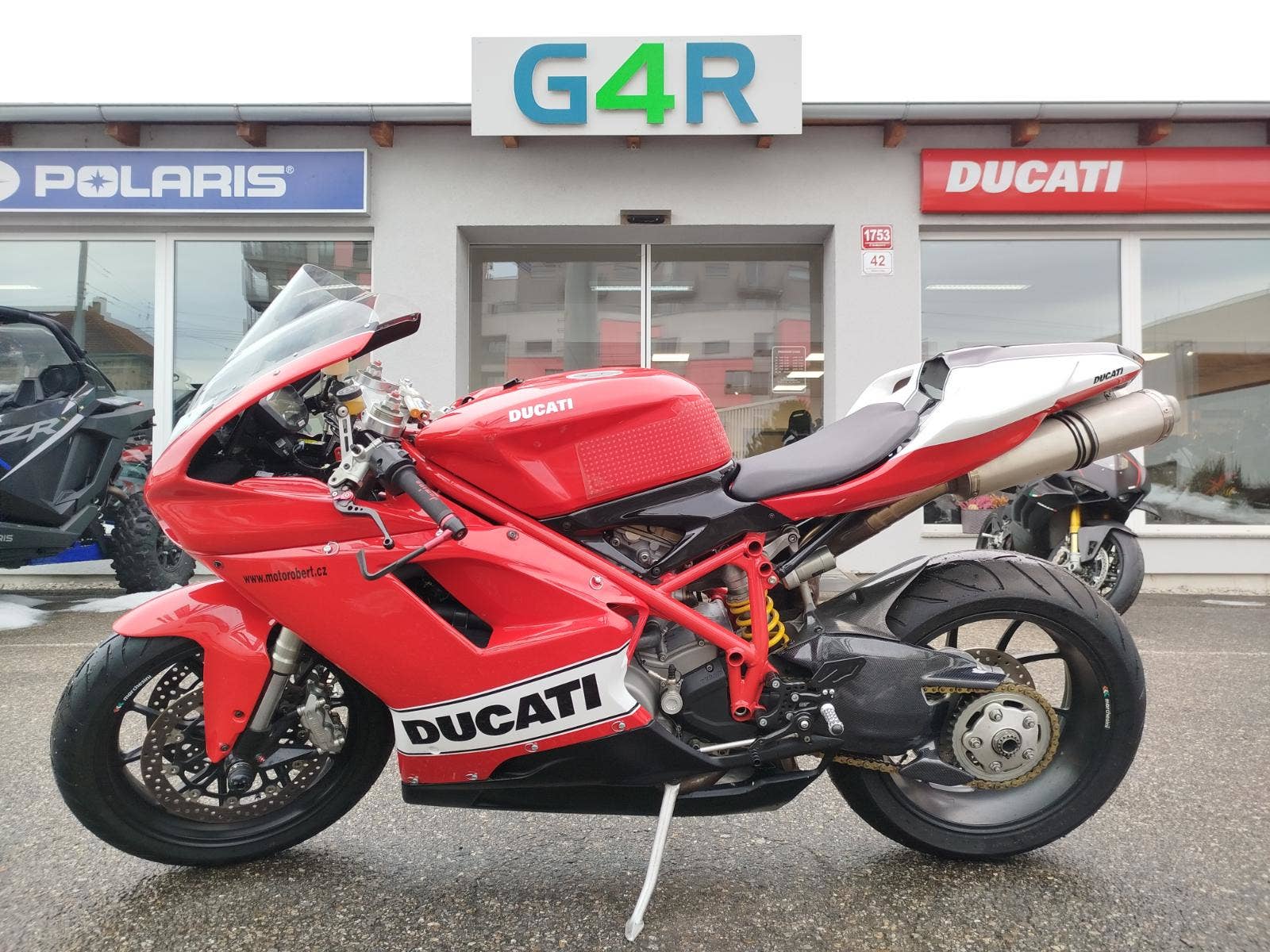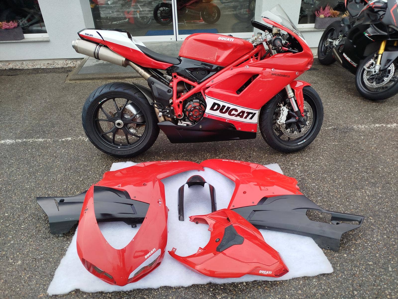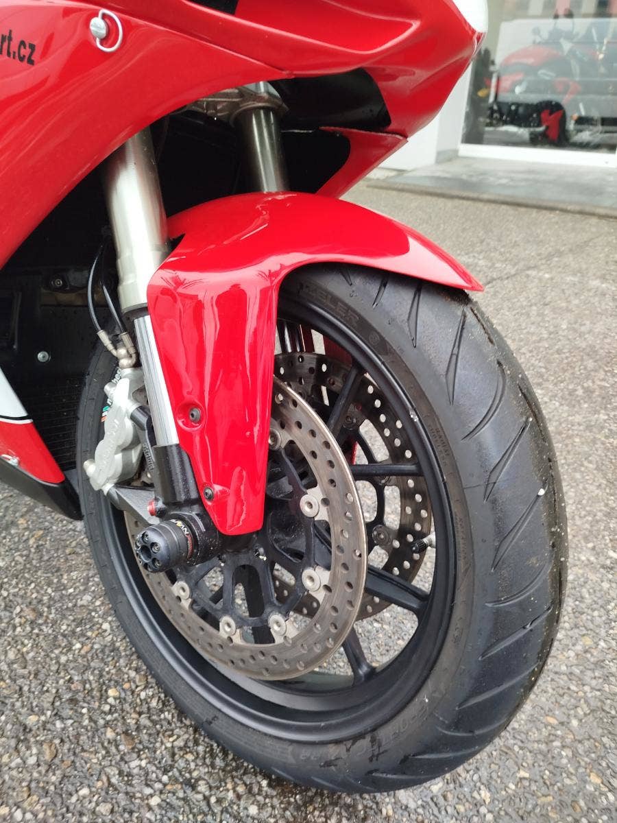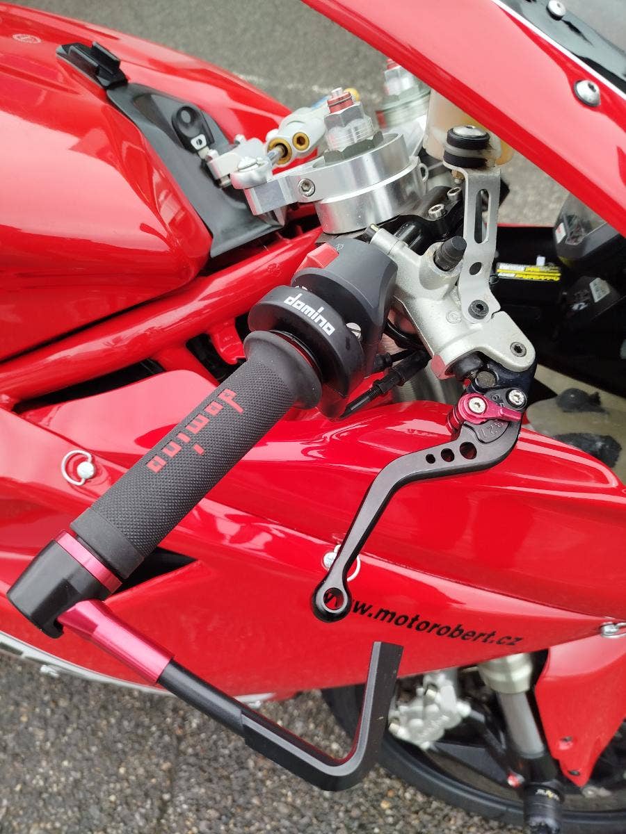Nabízíme k prodeji krásnou Ducati 848 z roku 2008 a nájezdem 11 353 km převlečenou do kapot. Motorka zakoupená jako nová v ČR v autorizovaném dealerství Ducati. Nyní druhý majitel, 2x klíče, kodovací karta, uživatelský manuál, servisní kniha, elektronický záznam. Pravidelný garanční servis pouze v autorizovaním prostředí, rádi doložíme. Nyní čerstvě po garanční prohlídce u nás. Výměna oleje, olejového filtru, diagnostika, nová baterie. Od desmo servisu najeto cca 500 km. Motorka poskládaná na krásných neporušených kapotách. K dispozici samozřejmě původní kapotáž včetně světel blinkrů v neporušeném stavu dobře zabalené. Bohatá nadstandardní výbava čítající: tlumič řízení, quikshifter, stavitelné páčky, rychlopal Domino, kryty páček, stavitelné přepákování, otevřená spojka. K motorce 3x krabice dílů. Vše je v moc hezkém stavu a lze snadno přeskládat do původního stavu.