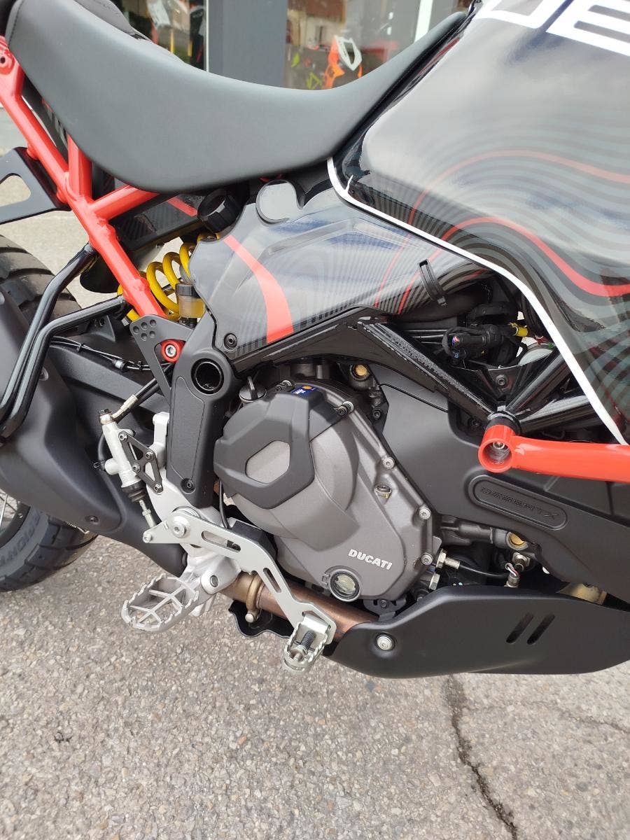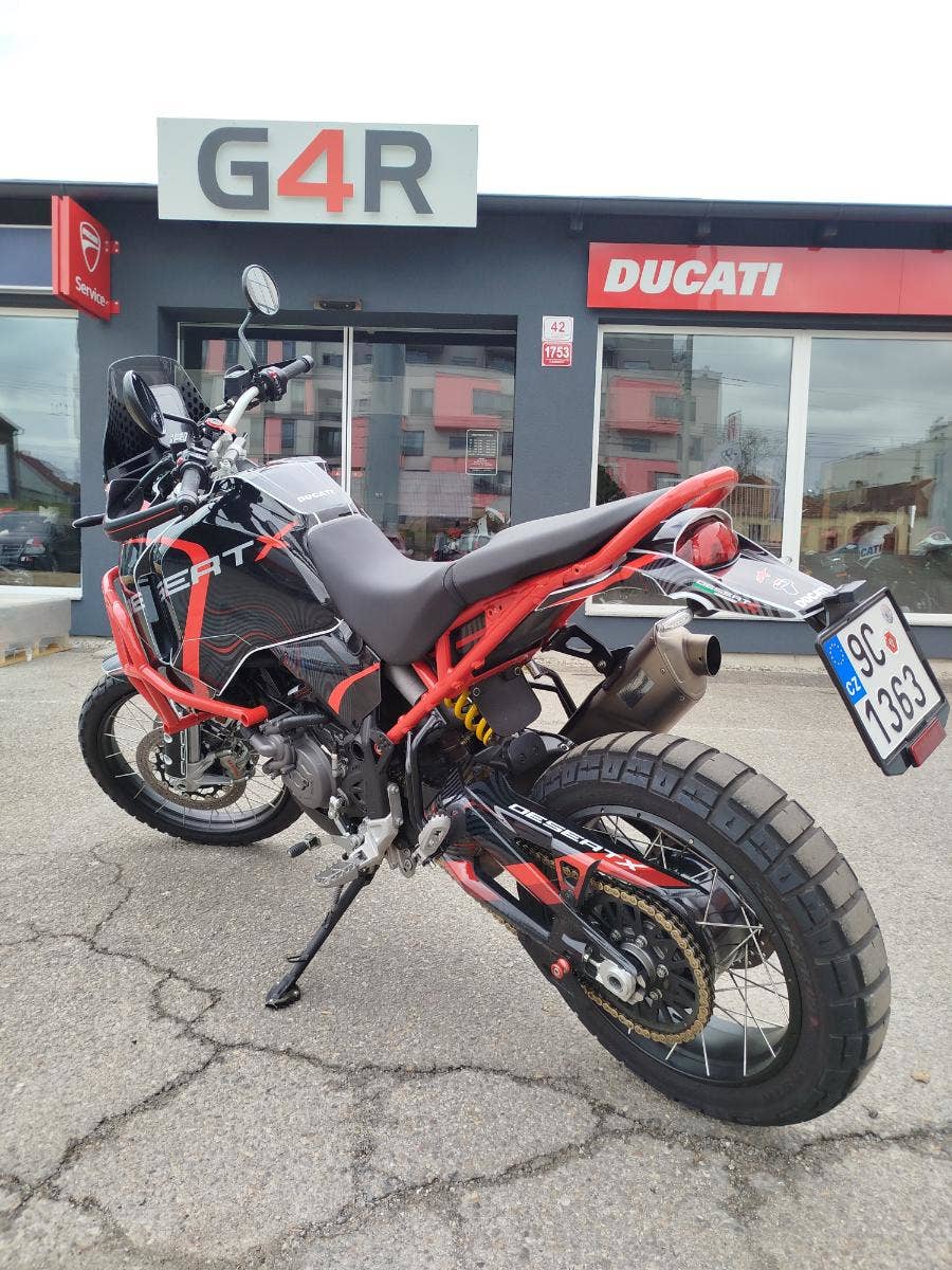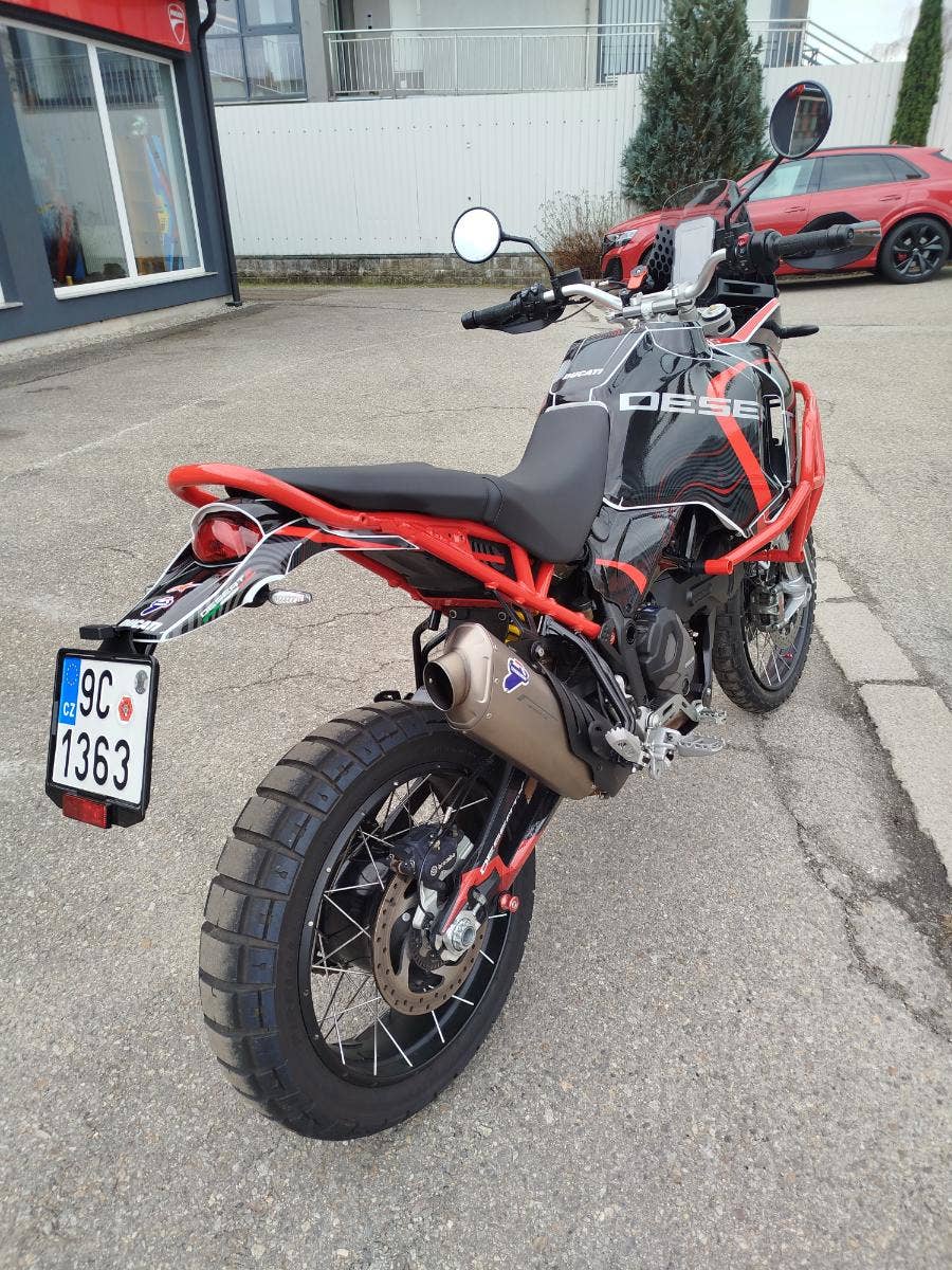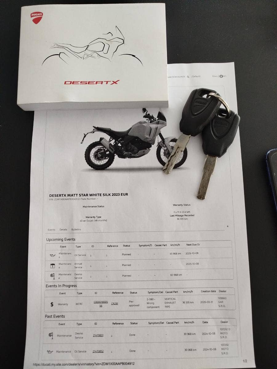 Nabízíme k prodeji moc hezkou Ducati DesertX, z roku 2023 a nájezdem 36 335 km. Motorka zakoupena jako nová v ČR v autorizovaném dealerství Ducati. 2x klíče, elektronická servisní kniha, manuál. Bohatá výbava čítající: kompletní laděný výfuk Termignoni včetně racingové mapy (původní k motocrce), padací rám, kompletní celopolep, nižší plexi, vyhřívané rukojeti, dynamické LED miniblinkry, lakovaný kryt pod motorem. Pravidelný garanční servis pouze v autorizovaném prostředí servisu Ducati. Motorka má za sebou Desmo servis, nyní čerstvě po garanční prohlídce. Výměna oleje, olejového filtru, diagnostika, celková kontrola. Motorka v moc hezkém stavu s bohatou výbavou, bohužel s menším záznamem v Cebii.
