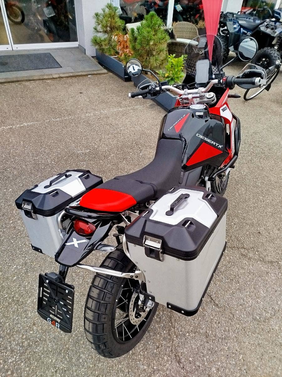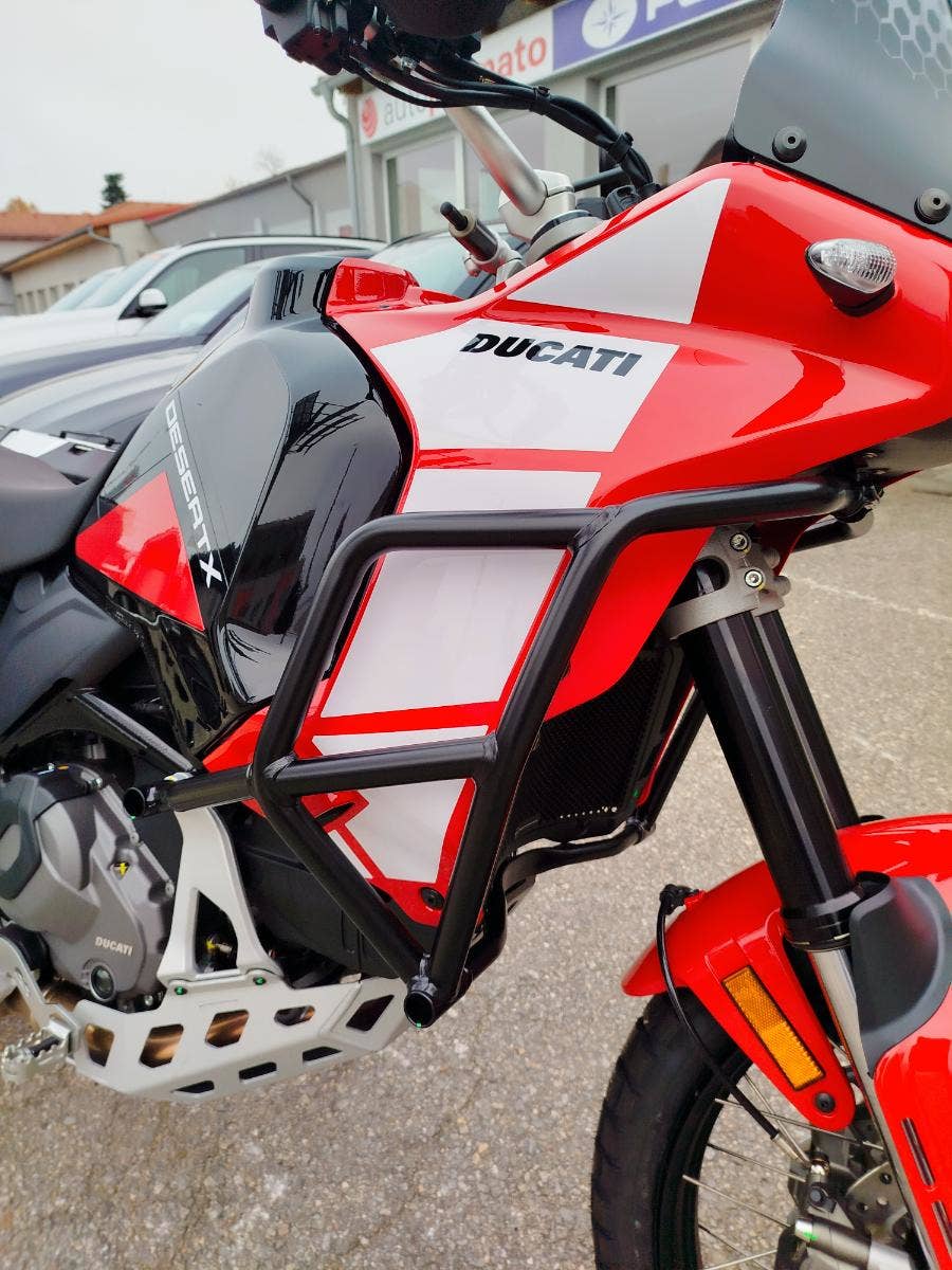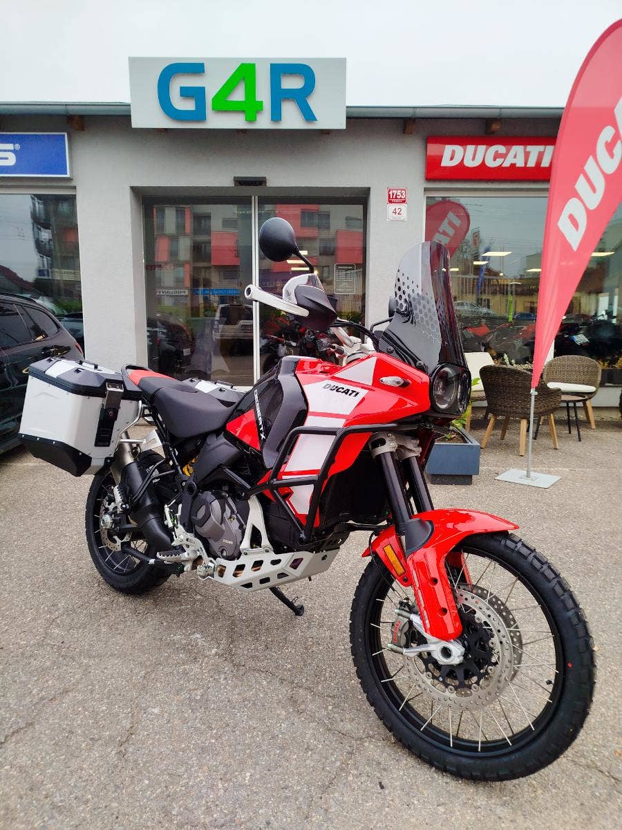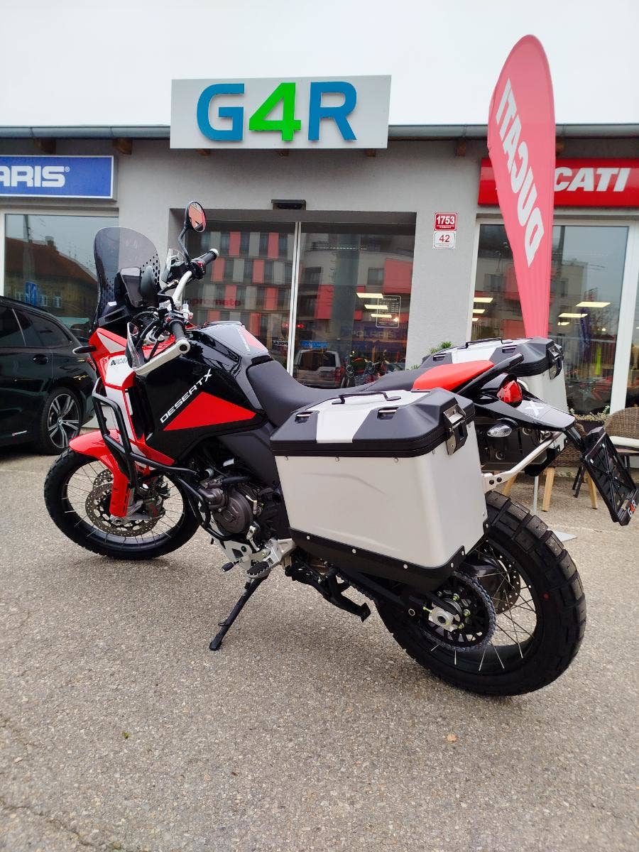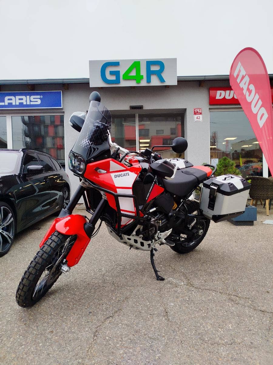 Nová a v základu nadstandardně vybavená verze už tak oblibéného DesertX nyní s názvem DesertX Discovery. V základním balíčku si DesertX Discovery poveze: rozšíření krytů rukojetí včetně pevnější konstrukce, výhřev rukojetí, navigaci Turn by Turn, cestovní plexi, sadu dvou bočních hliníkových kufrů včetně potřebné montážní sady, hlavní stojan, kryt pod motor, mřížku chladiče a pevný padací rám. Opravdu bohatá výbava díky, které se můžete vydat prakticky kamkoliv bez kompromisů. Průzkum. Zábava. Výkon. A opravdová chuť vyrazit a zamířit k horizontu. Identita tohoto motocyklu nenechává žádné pochybnosti – stačí jediný pohled a budete snít o dobrodružství. A s výbavou DesertX Discovery můžete ještě volněji prozkoumávat neprozkoumané, bez překážek. Výbava DesertX Discovery obsahuje speciální povrchovou úpravu Thrling Black a Ducati Red vytvořenou s lepicí grafikou, která chrání povrchy před poškrábáním, a komplexní balíček standardního příslušenství, aby byla ještě lépe vhodná pro průzkum.