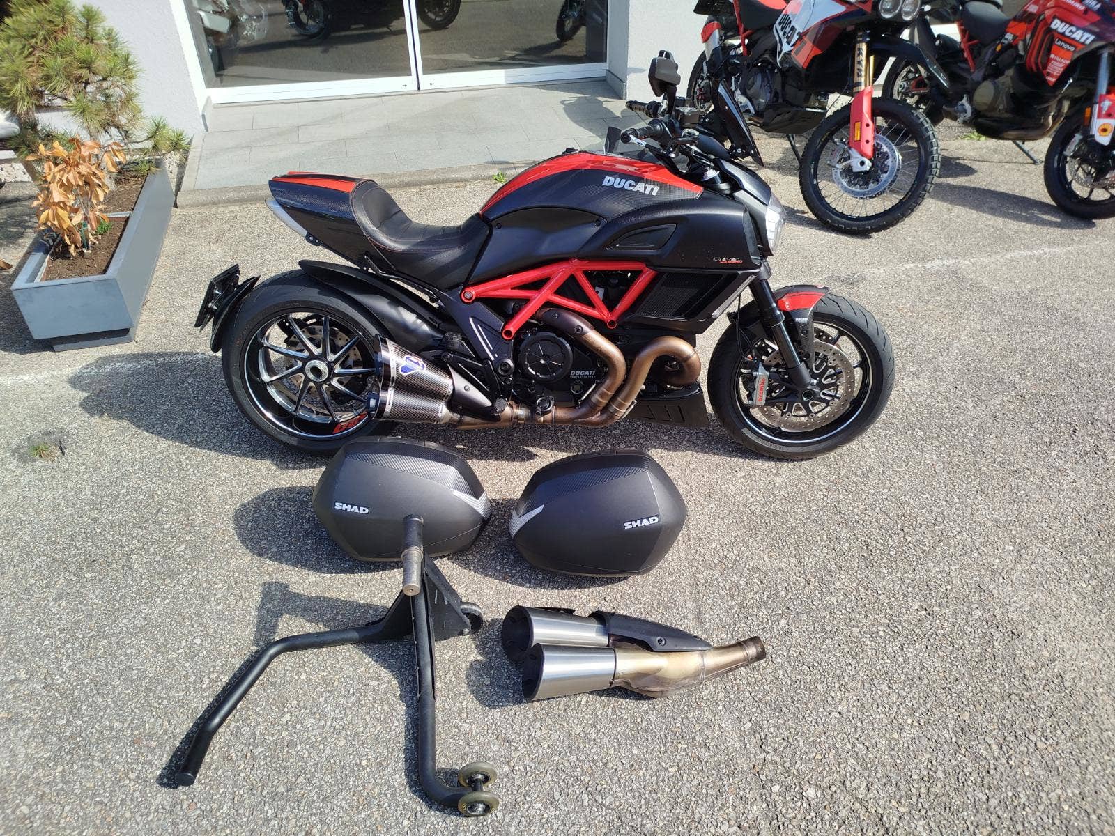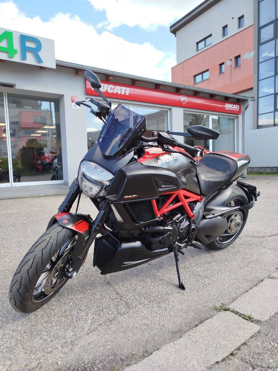 Nabízíme k prodeji Ducati Diavel 1200 Carbon Red and Matt Carbon z roku 2016 a nájezdem 29 327 km. Motocykl dovezen ze zahraničí v ČR první majitel. 2x klíče, servisní kniha, uživatelský manuál, výpis z elektronické servisní knihy. Motorka nyní po garančním servise. Výměna oleje, olejového filtru, diagnostika, celková kontrola. Ve výbavě sada bočních nosičů včetně dvou kufrů, montážní stojan, laděný výfuk (origo k motorce), chrániče páček, vyšší plexisklo.