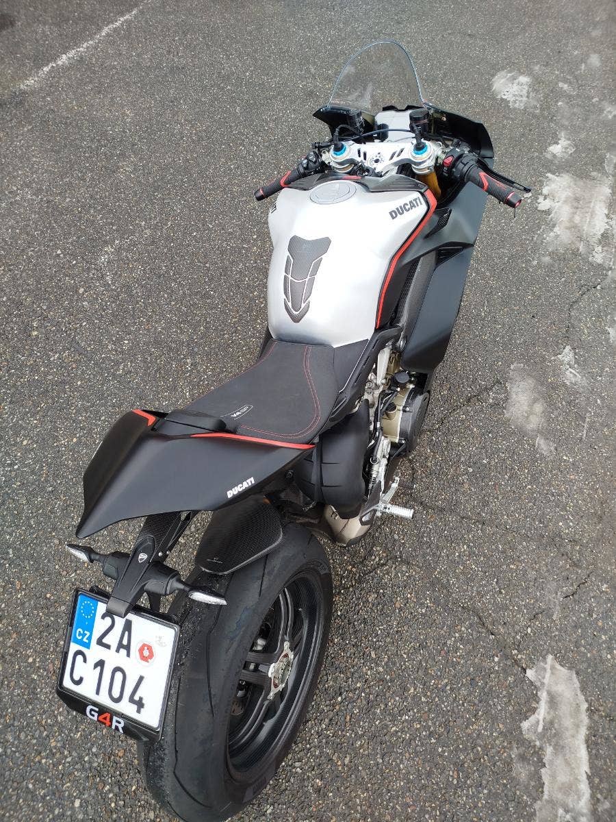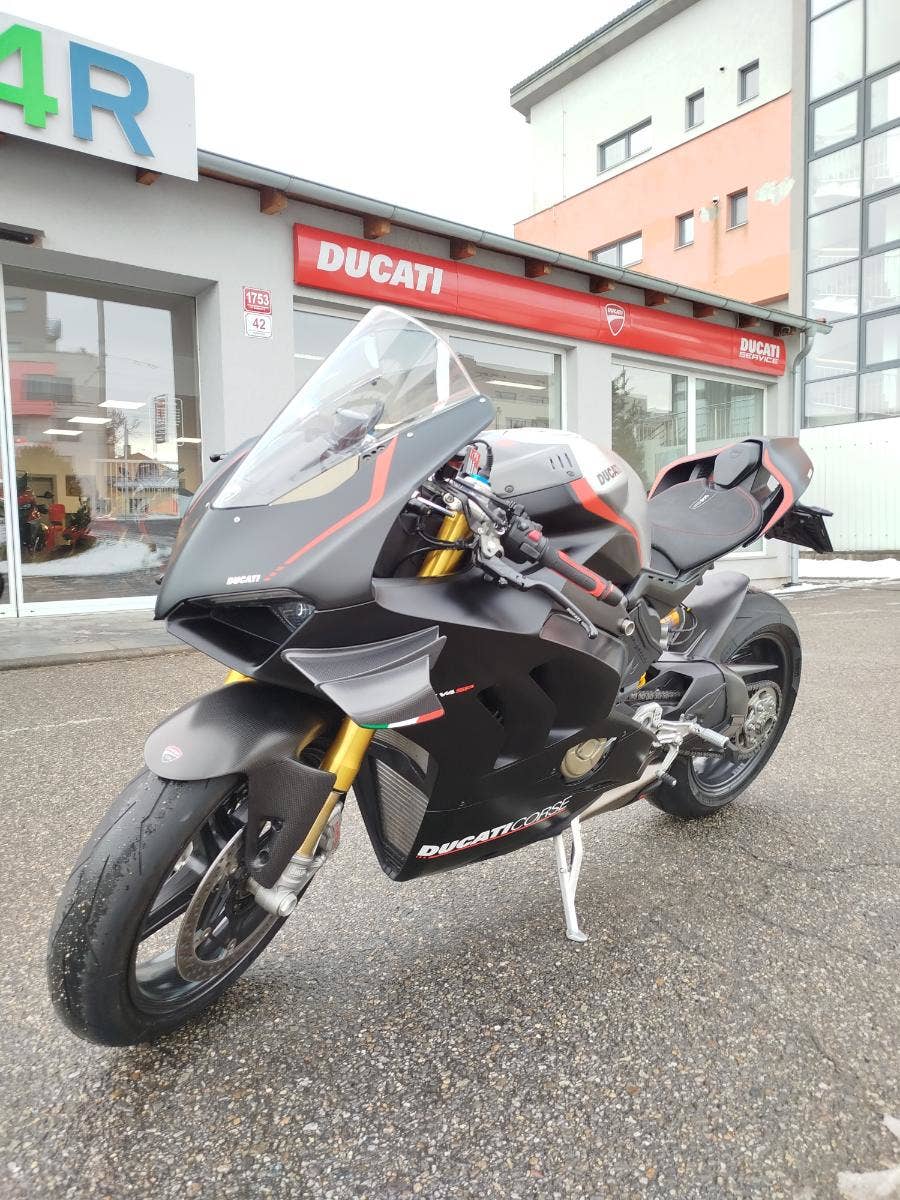 Nabízíme k prodeji nádhernou Ducati Panigale V4 SP z roku 2021, nájezdem 4 331 km a pořadovým číslem: 396. Motorka zakoupena nová v ČR v autorizovaném dealerství Ducati. 2x klíče, elektronický servisní záznam. Pravidelný garanční servis pouze v autorizovaném dealerství Ducati. Od posledního servisu najeto 1 000 km. Nyní vyřešeny všechny svolávací akce, motorka je zkontrolovaná a připravená na dalšího majitele. Kompletní keramika včetně disků. K motorce bohatá výbava čítající: homologovaný laděný výfuk Akrapovič, středový stojan, kratší držák SPZ, LED miniblinkry, otevřený krabonový kryt spojky, karbonový kryt nádrže, karbonový přední + zadní blatník, stavitelné páčky, gripy, víčko nádrže Rizoma, boční tankpady nádrže. Původní věcí k motorce. Krásná opečovávaná Panigale v nevídaném provedení SP s jasným původem, minimálním nájezdem a bohatou výbavou.