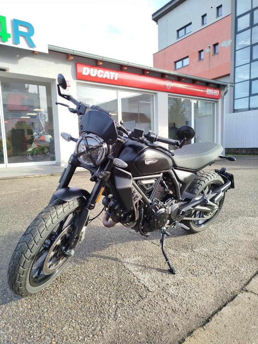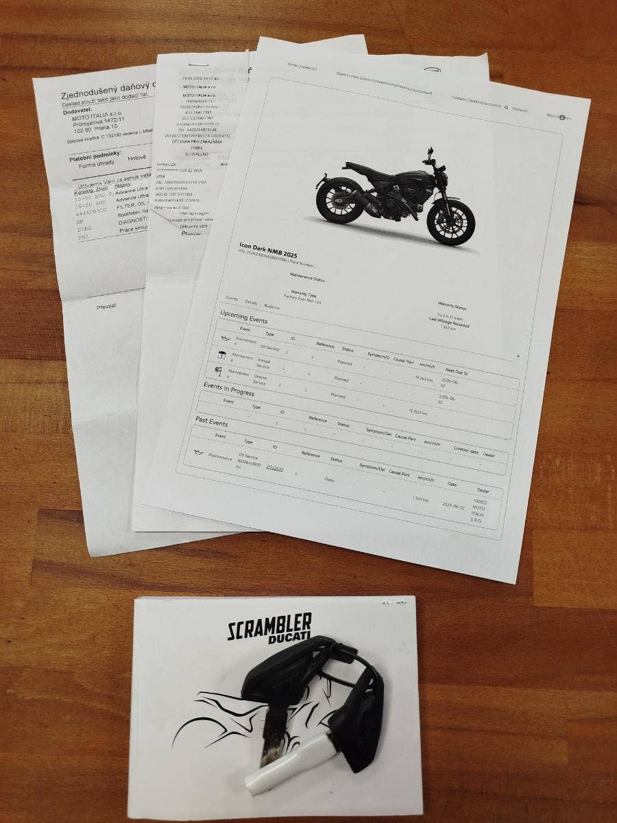 Nabízíme k prodeji krásnou zánovní Ducati Scrambler Icon Dark z roku 2025 s nájezdem pouze 5 493 km. Motocykl zakoupen jako nový v ČR v autorizovaném dealerství Ducati. 1. majitel, 2x klíče, uživatelský manuál, elektronický servisní záznam. Snížený výkon na 34.2 kW, možnost řídit s řidičský průkazem sk. A2! Samozřejmě možnost otevření na plný výkon. Motocykl po garančním servisu a celkové kontrole. Pouze autorizovaný servis. Snížená řídítka, doplňková zrcátka. Veškeré původní díly jsou k motorce. Motorka v krásném stavu s jasným původem, zárukou a hezkou výbavou.