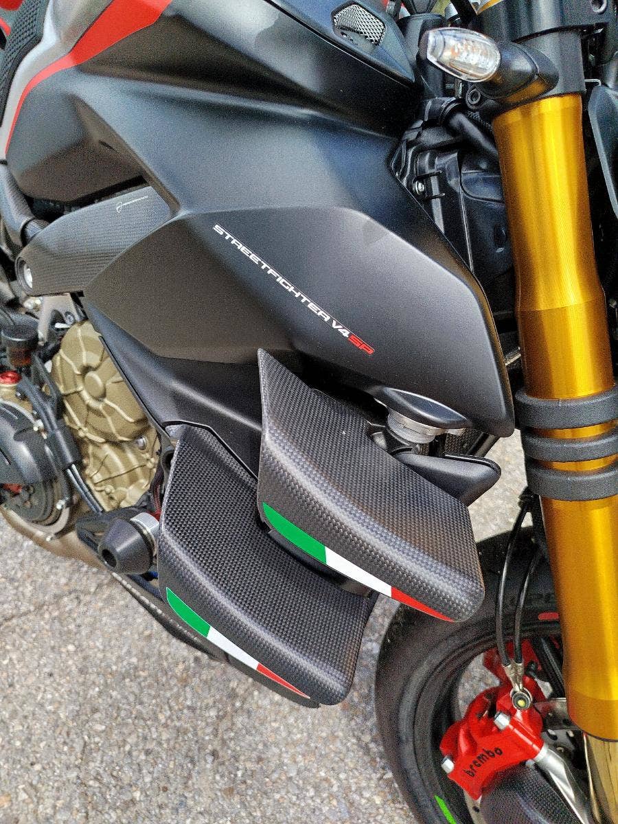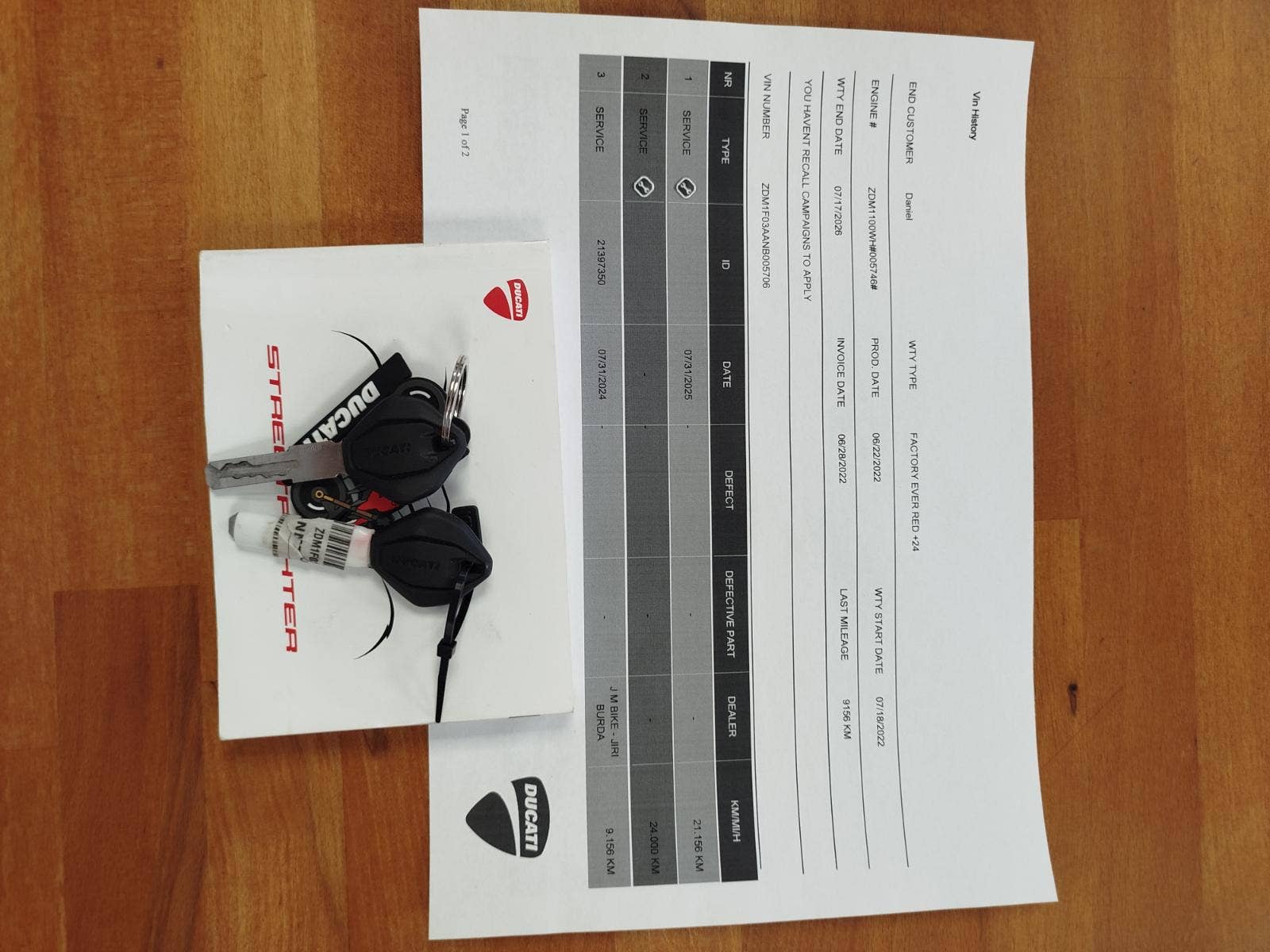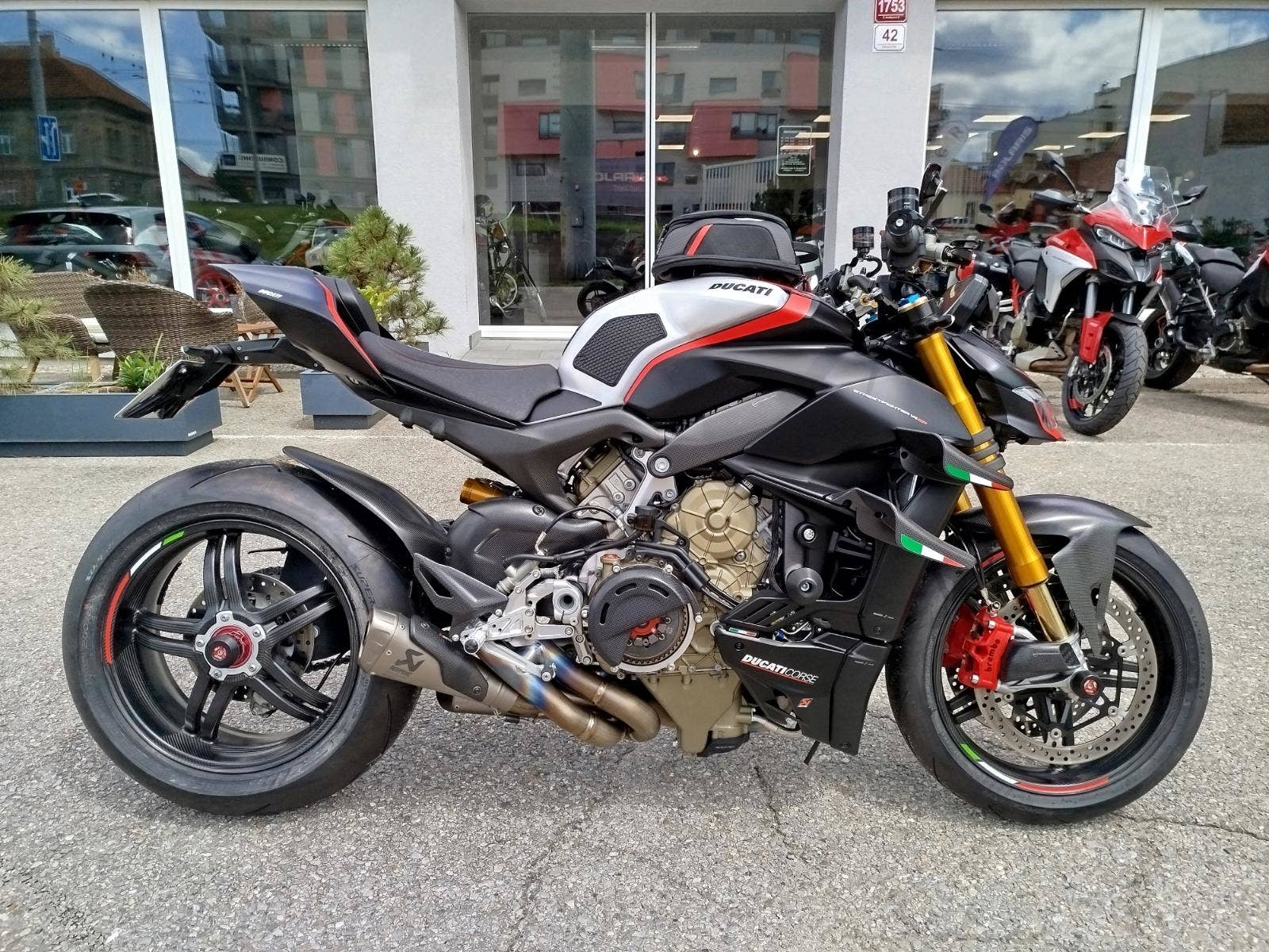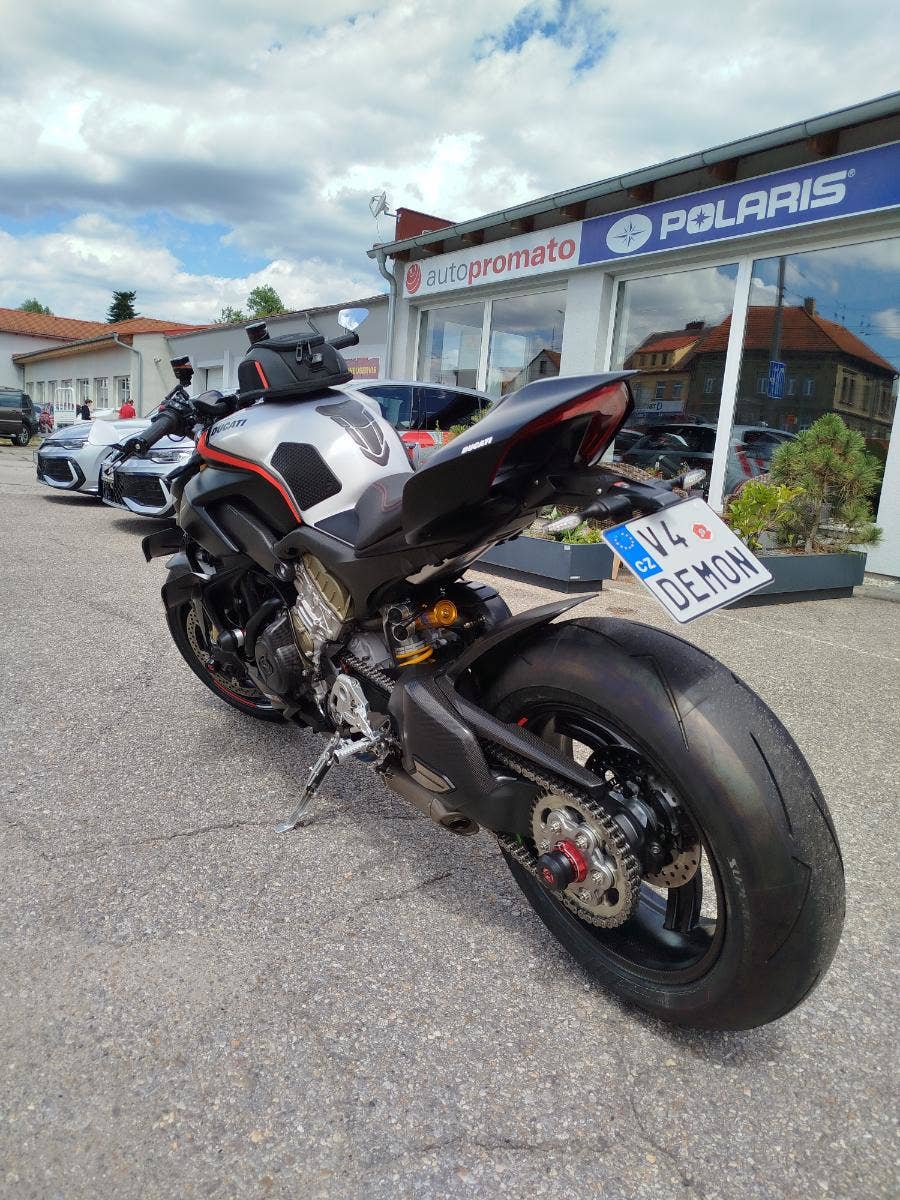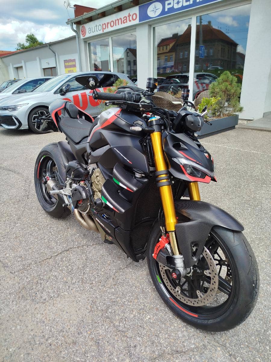 Nabízíme k prodeji tento ikonický motocykl Ducati Streetfighter V4 SP, rok 2022, najeto: 10 130 km, N. 1201. Motocykl zakoupen jako nový v autorizovaném dealerství v ČR, pravidelný pouze autorizovaný servis, stále v tovární záruce. 2x klíč, manuál, výpis z elektronické servisní knihy. Bohatá výbava čítající: kompletní laděný výfuk Akrapovič včetně mapy, velká spousta carbonových doplňků, tankvak, stavitelné páčky, zrcátka, mřížky chladiče, kratší držák SPZ a další. Nyní čerstvé přezutí.